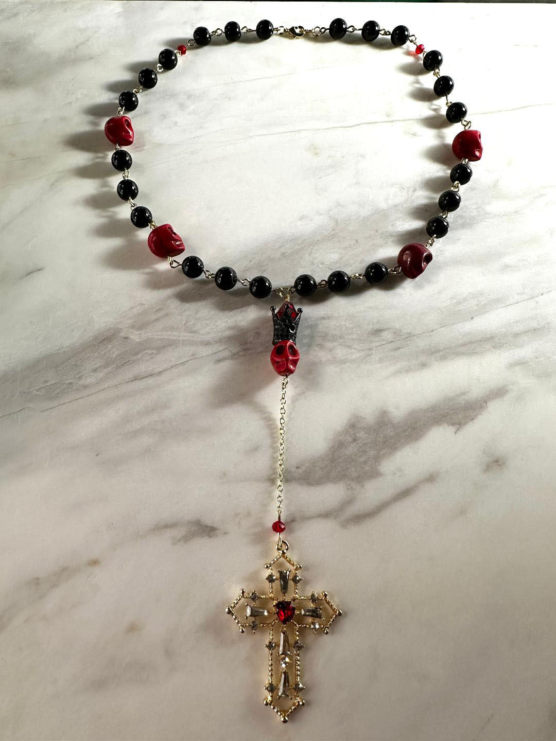 Dia de los Muertos, Gothic, Fine Jewelry, Black Onyx Agate beads, Howlite Red Skulls, Red faceted Beads, Tall Rhinestone Crown With Gold Cross. 18" Necklace with 5.25" Dangle.